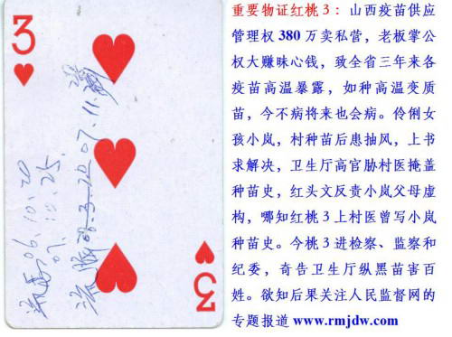 2008年9月期间,老百姓相互转告,人民监督网报道,山西省的疫苗有问题,高温变质了,接种这样的疫苗不定会得什么样的病,听了这个说法,我们立即查询孩子什么时间接种过什么疫苗,由于防疫员给孩子接种疫苗时,常常不往预防接种证上填写,只登记在他的接种底簿上,我们特意找了村防疫员,询问高小岚三年来接种了那些疫苗,村防疫员翻阅了接种底簿,随手拿了一张扑克牌,写了一会儿递给了我们,这是一张扑克牌红桃3,上面写着我侄女接种疫苗种类和日期。