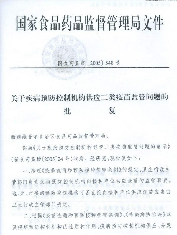我们根据该诡辩之词,认真地研读了《条例》,学习了卫生部、国家药监局关于贯彻《条例》的有关文件。卫生部2005年5月17日下发了,卫政法发〔2005〕187号文件“关于认真贯彻实施《疫苗流通和预防接种管理条例》的通知”要求,“各级卫生行政部门和疾病预防控制机构要加强对第二类疫苗的使用管理。”国家药监局2005年11月18日向各省下发了,国食药监市[2005]548号文件《关于疾病预防控制机构供应二类疫苗监管问题的批复》中指出,“一、按照《疫苗流通和预防接种管理条例》的规定,卫生行政主管部门负责疾病预防控制机构向接种单位供应疫苗的监管职责,地、州、市疾病预防控制机构可否直接向接种单位供应疫苗应当有卫生行政主管部门确定。二、根据《疫苗流通和预防接种管理条例》、《传染病防治法》以及疾病预防控制机构的性质和作用,疾病预防控制机构供应、分发疫苗无需领取《药品经营许可证》。”