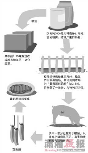 重庆日前查出一起“最毒饲料奶粉”案。不法商家从河北辗转千里,将含有三聚氰胺的奶粉运输来渝,销往重庆垫江、万州多个饲养场,其中一些奶粉三聚氰胺含量超标515.24倍。