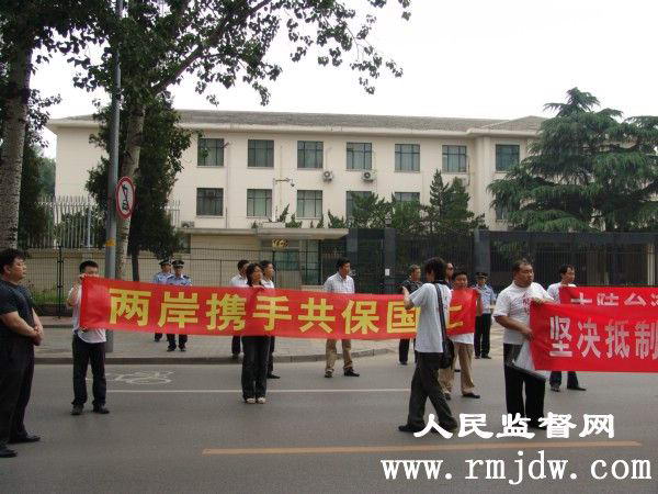 下午2点30分,示威的中国公民打着抗议的标语:“大陆台湾一家人”、“日本滚出东海”、“两岸携手共保国土”、“坚决抵制日本设定中国东海中间线”……,走到日本国驻华使馆前。