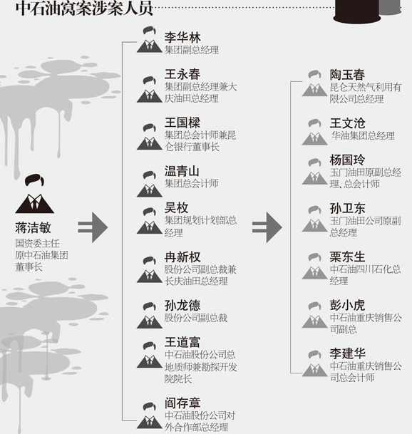 中国在2012年底掀起的反腐风暴已经触及到政府机构和国有企业。中国石油天然气集团公司成为一大反腐目标,至少六名现任和前任高管落马。