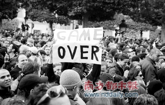 ▲得知总统本·阿里仓皇逃亡后,突尼斯示威民众高兴地打出了“玩完”的标语。