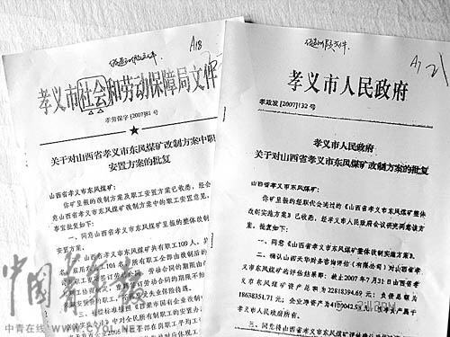 伪造的孝义市二轻总公司《关于对山西省孝义市东风煤矿改制方案的批复》说:“同意将东风煤矿评估确认后的净资产在吕梁市产权交易市场公开、公平拍卖。原东风煤矿债权债务全部由山西省孝义鑫辉煤业有限公司承继。”落款日期为2007年8月12日。
