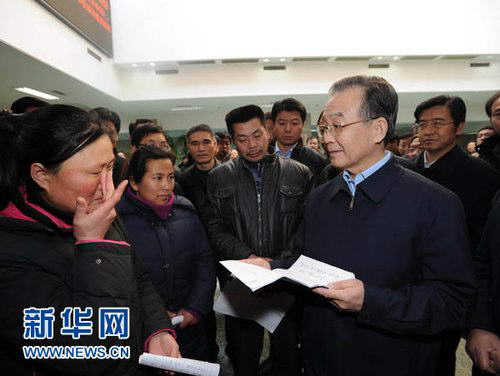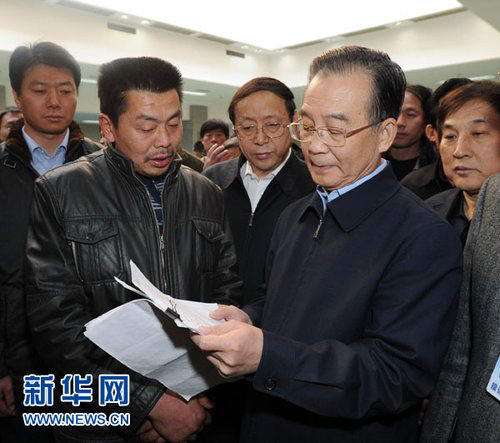 1月24日,中共中央政治局常委、国务院总理温家宝前往国家信访局,与来访群众进行面对面交流,了解他们的困难和要求,并就政府工作听取意见。这是在信访局接待大厅,温家宝总理向来访群众了解他们的诉求情况。