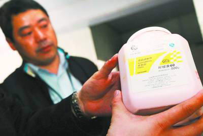 4月12日,上海,执法人员正在展示用于给馒头染色的着色剂——柠檬黄。
