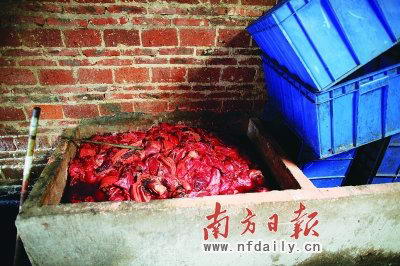 发臭猪肉泡在池中。资料图