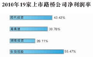现代投资在19家路桥业上市公司中主营收入只居中游,19家高速公路上市公司的净利润率最低也接近20%(见右图)。