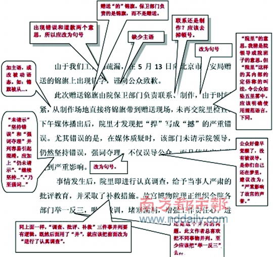 按照他的分析,这篇三个自然段、不足300字的道歉信,语法、标点等方面的问题居然有12处之多。比较明显的是,道歉信的第二段末尾提到:“尤其错误的是,在媒体质疑时……仍然坚持错误……不仅误导公众,而且使故宫的声誉受到严重影响。”对此,“一派天机”认为,“误导公众”并不妥当,“公众好像早就觉醒了,没有被误导”。