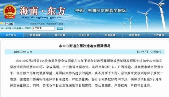 东方市政府网站在2011年7月15日发布的《市中心街道立面改造追加预算情况》