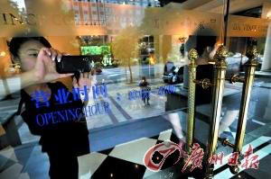 本月中旬,有多位消费者到达芬奇广州店要求退款遭拒,而达芬奇店的一位职员背靠大门双手握住门把拒绝记者入内采访,另有一位职员用手机拍摄记者采访情况。 记者莫伟浓/摄