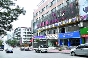 青北一街路口,“明阳酒店”很显眼,门口有个红色的生日牌。一楼大堂里,沙发、柜台等陈设布满灰尘,电梯的电脑板被拆下,早已停运。酒店没有经营了。二楼却传出哗啦哗啦的麻将声。