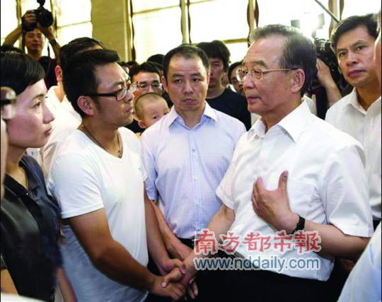 温家宝:应该感谢温州人民!我确实在多个场合,包括在国外都给予温州人民以赞扬,因为他们闯荡天下,具有改革开放和创新的意识,具有创业的精神。在这起灾难发生的时候,温州人民又向世人展示了他们的另一面,那就是大爱的精神。他们自觉地组织起救援队,参加救助工作,有上千人主动到献血站去献血。他们还对遇难者家属以及受伤的群众提供了良好的医疗设施,进行了耐心细致的抚慰工作。我今天来到温州,实在没有时间在这里多看一看,但是我感谢这里的人民,谢谢你们!