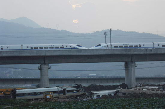 7月25日傍晚,事故车辆残骸上方列车运行正常。当日,甬温线特别重大铁路事故路段恢复通车。新华社记者 黄宗治 摄