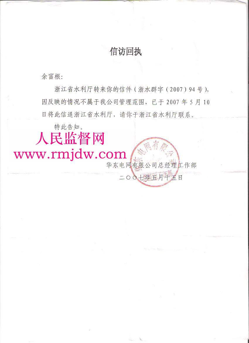 (3)前坞村的余富根,工业园区强行挖掉他的土地,也没有付一分钱,余富根没有办法阻止工地老板挖农田,因在余富根家里,村长吴顺发为他说了一句公道话:“挖掉的土地确实没付钱”,但却遭到一批流氓恶棍的拳打脚踢,把吴顺发打成轻伤,住院50多天才好。另外把余富根的价值十几万元的货船强行报废,一分钱不赔。余富根为上访把船抵押给别人,无处可住、流落街头,乞讨为生。第一次在2006年10月10日到北京上访,被浙江省办事处抓住,然后淳安县千岛湖镇董××、信访局王××、前坞村书记吴××去北京把我带回淳安。第二次,2007年1月5日到北京中央信访局48号接待室,他们材料都不看,叫我到省里去。2月15日余富根到中央水利部上访,他们却不收材料说:“中央不管水库”,2月25日余富根再次到中央水利部及中央国土部信访局,但他们始终不收材料。第三次2007年7月10日,余富根又一次到北京中央水利部,但它们还是不收材料。2008年余富根把劈山填湖的有关资料寄到中央建设部、水利部监督科及中央检察院也毫无结果,余富根为阻止园区非法劈山填湖,从县到市、省相关部门全部跑遍,但他们都互相推诿,此事毫无结果,甚至到华东电力公司但得到的答复是他们是企业管不了水库。据余富根调查所知,淳安县工业用地30公顷,范围365平方公里(全水域)却上报还不到四分之一,对上报,地方政府是按国家相关政策给征用土地的百姓如何安置,对园区开发经过中央批准同意开发的,要他们拿出文件向百姓公开,他们却不同意,实际就是弄虚作假、欺上瞒下。关于上告一事,2007年八月中旬县委王主任、县委徐秘书说你是淳安的公民,为什么把淳安告倒。我问千岛湖镇书记王昌迪农民承包的土地自己有没有自由权,得到的答复是土地是集体的农民无权作主,反而要我滚出去。陈志华副镇长找我谈话,叫我不要上告,但就是不给老百姓解决问题。本人原来开船维生,船也被强行停开,为了维护自己的权益,上下跑来跑去,化光所有集蓄不算,到处借帐,本人现无家可归,借住朋友船上,过着非人生活。本人到处上告,到过国家信访局、水利部、国土资源部、以及省市有关部门,但至今没有处理。上访材料寄遍各有关部门,都在推卸责任。