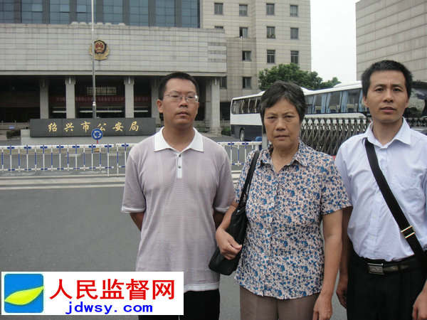 图:法学博士滕彪(左一)、访民王苗珍(中)、调查记者朱瑞峰(右一)到绍兴市公安局纪检委