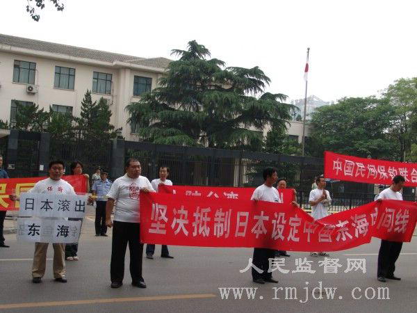 下午2点30分,示威的中国公民打着抗议的标语:“大陆台湾一家人”、“日本滚出东海”、“两岸携手共保国土”、“坚决抵制日本设定中国东海中间线”……,走到日本国驻华使馆前。