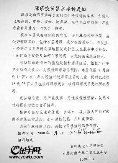 了解,不少地方前两天都张贴了《紧急通知》,要求市民于7月3日统一到指定地点接种麻疹疫苗。