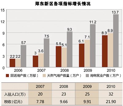 官方数据显示:建设8年的郑东新区,2010年固定资产投资首次突破200亿元,累计固定资产投资完成近1000亿元,年度财政总收入首次突破100亿元,固定资产投资、地方财政收入、地方一般预算收入和出口总值四项指标增幅居郑州市第一;固定资产投资和财政收入绝对值、增幅创历史最好成绩。税收从2005年的2.17亿元增加到2010年的21.90亿元,增长10倍。