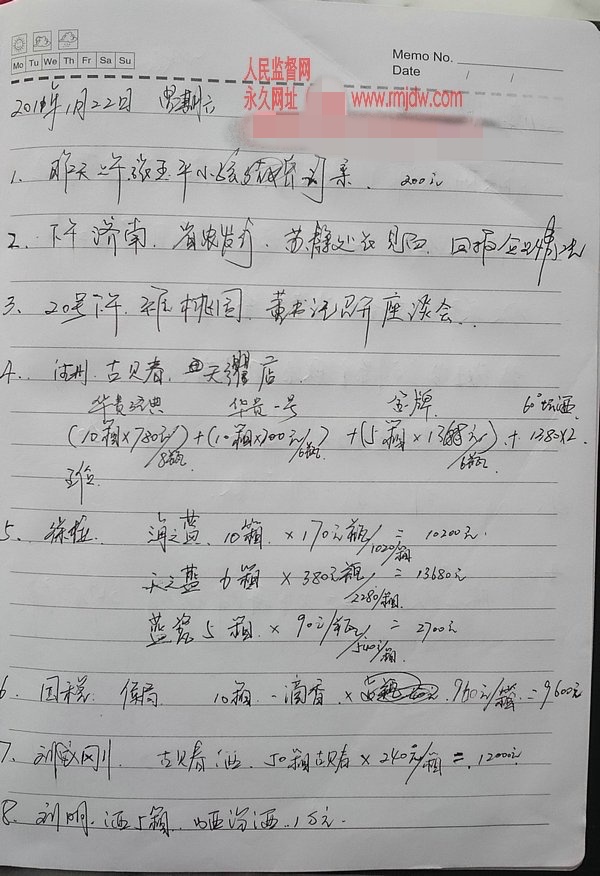今年45岁的张雷达有写日记的习惯,上面就是他的日记内容。张雷达系山东照东方纸业集团旗下山东德州福源生物淀粉有限公司总经理。在他的近20本日记中,人民监督网记者初步统计发现,里