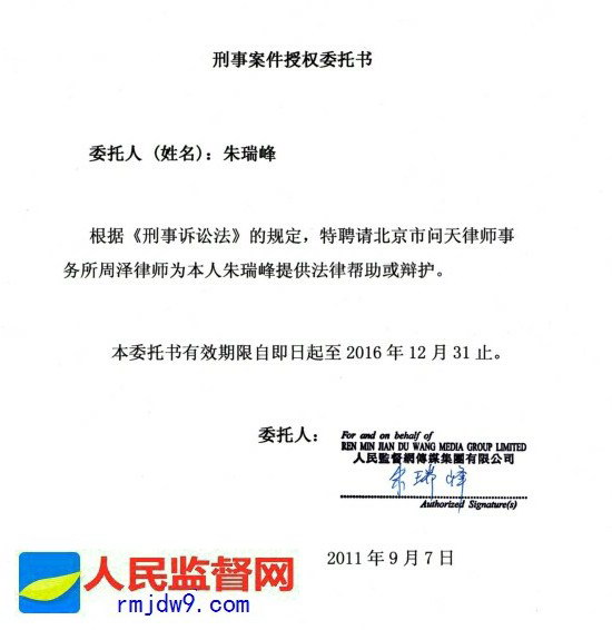 根据《刑事诉讼法》的规定,特聘请北京市问天律师事务所周泽律师为本人朱瑞峰提供法律帮助或辩护。