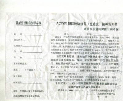 山西卫生厅疾控中心现在发布一张接种流脑疫苗的廉价杀人通知书,过一段轮到其他疫苗接种时,定会有新的通知书发给山西老百姓。