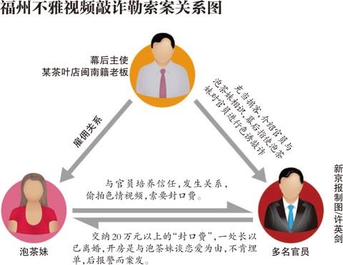 福建行政学院一位要求匿名的教授介绍,今年春节之前的福州官场就开始流传一起不雅视频敲诈勒索案的幕后故事。案件起因是福州一家茶叶店的泡茶妹与福州多名官员开房发生性关系,整个过程被房间内隐藏的针孔摄像头拍下。事后,泡茶妹以“艳照”要挟官员支付一笔20万元以上的封口费,否则即威胁称向纪委举报。事件的幕后主谋是一名闽南籍男性商人。