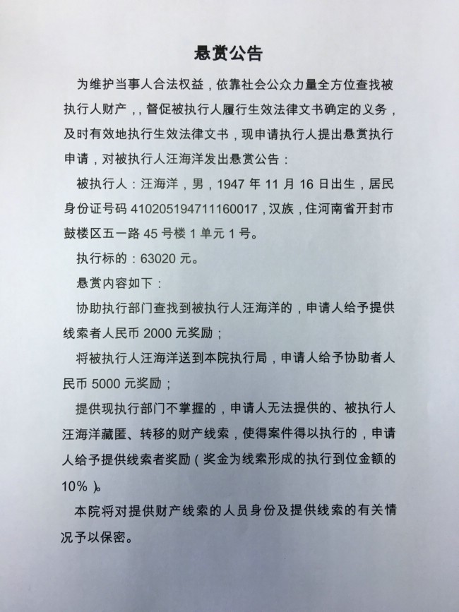 北京市西城区人民法院执行悬赏河南开封市鼓楼区被执行人汪海洋。