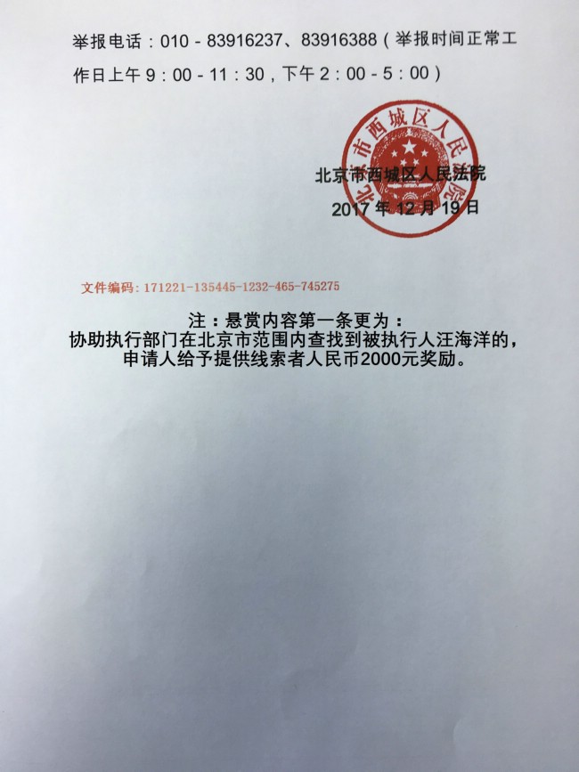 北京市西城区法院执行悬赏汪海洋公告_人民监督网