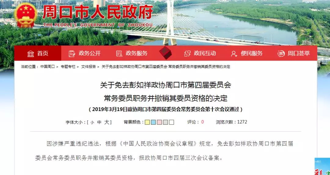 此前,据周口市人民政府消息,3月19日,政协周口市第四届委员会常务委员会第十次会议通过关于免去彭如祥政协周口市第四届委员会常务委员职务并撤销其委员资格的决定,决定称,因涉嫌严重违纪违法,根据《中国人民政治协商会议章程》规定,免去彭如祥政协周口市第四届委员会常务委员职务并撤销其委员资格,报政协周口市四届三次会议备案。