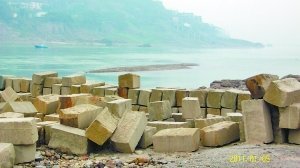 泥浆水流过 小溪已变成了白色 堆积在江边等待切割的青石 许多人知道嘉陵江是重庆主城区的饮用水源。然而,许多人不知道,眼下的嘉陵江,每天都承受着红白污染之痛!在北碚蔡家