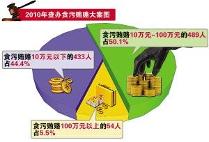 市检察院检察长余敏介绍说,检察机关2010年共查办贪污贿赂犯罪976人、渎职侵权犯罪177人,其中厅级以上干部15人、处级干部235人;贪污贿赂10万元以上的大案543人、100万元以上的54人,渎职侵权重特大案件82人。其中,查办民生、工程建设领域职务犯罪达833人,占立案总数的72.2%。在打黑除恶斗争中查处揭露出来的职务犯罪177人,其中司法人员87人。